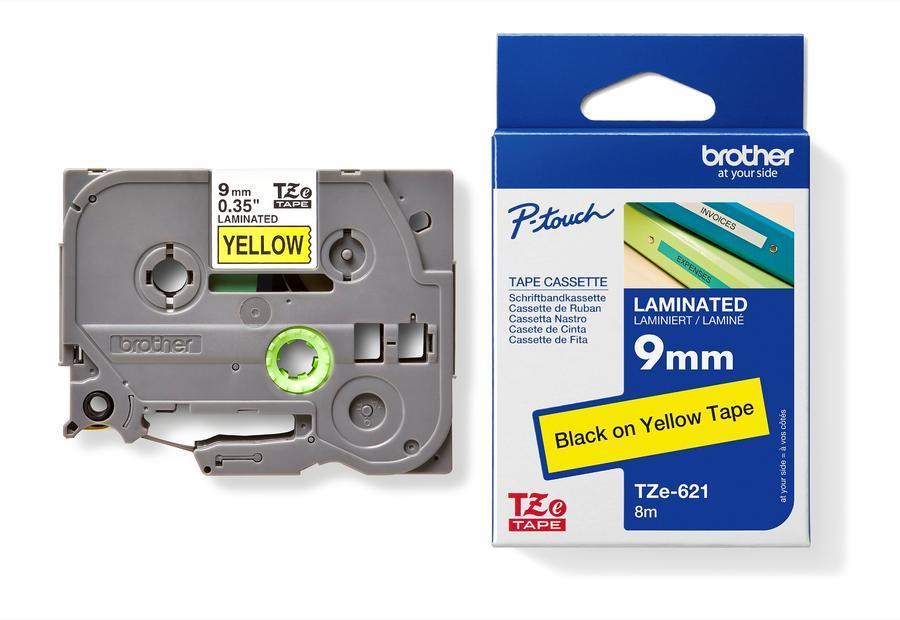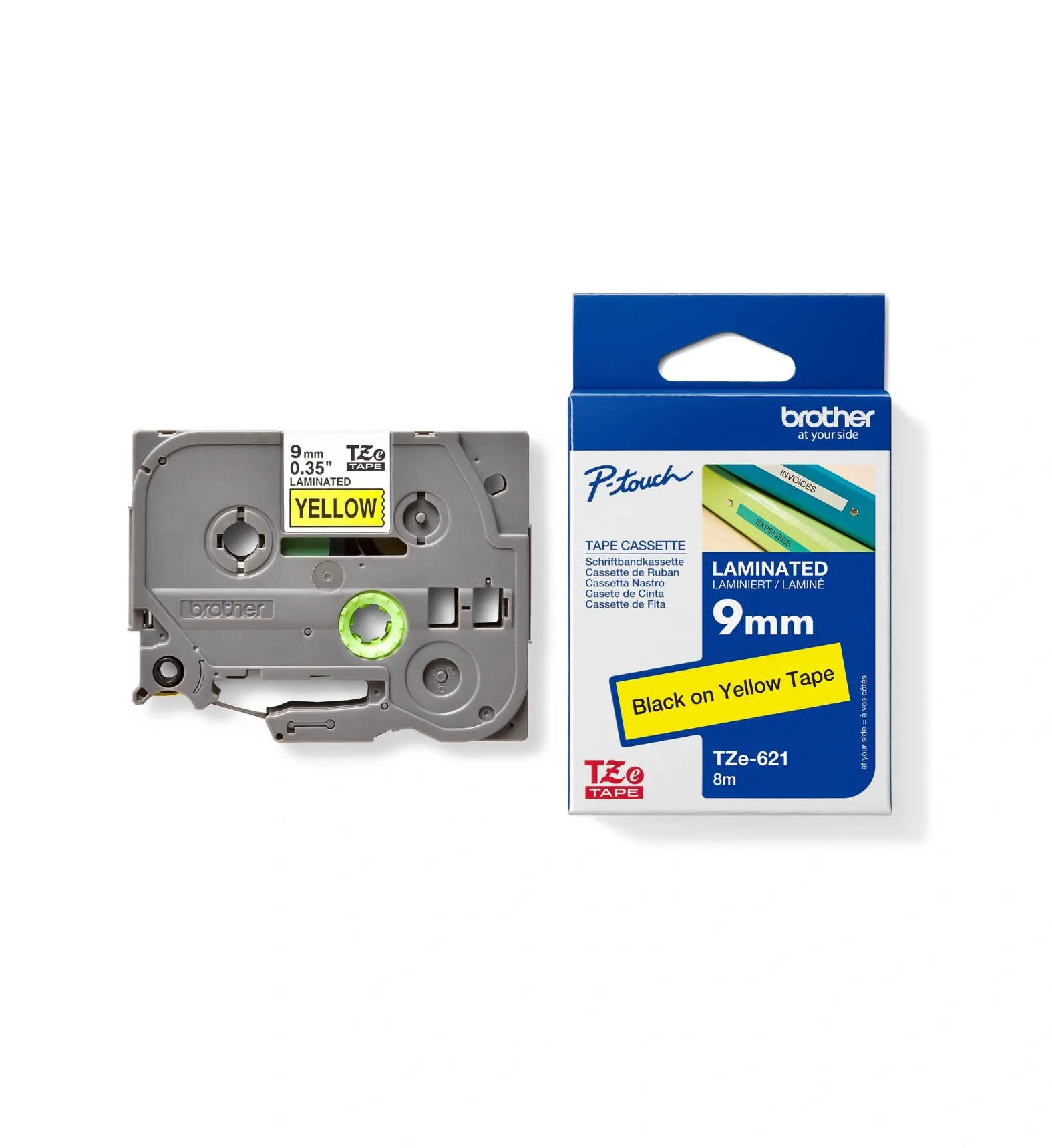 The Brother TZe-621 is a high-quality laminated labeling tape designed to withstand tough conditions. It produces durable, easy-to-read labels that resist fading, water, chemicals, and abrasion. The black-on-yellow combination provides excellent visibility, making it ideal for warning labels, filing systems, and cable marking
