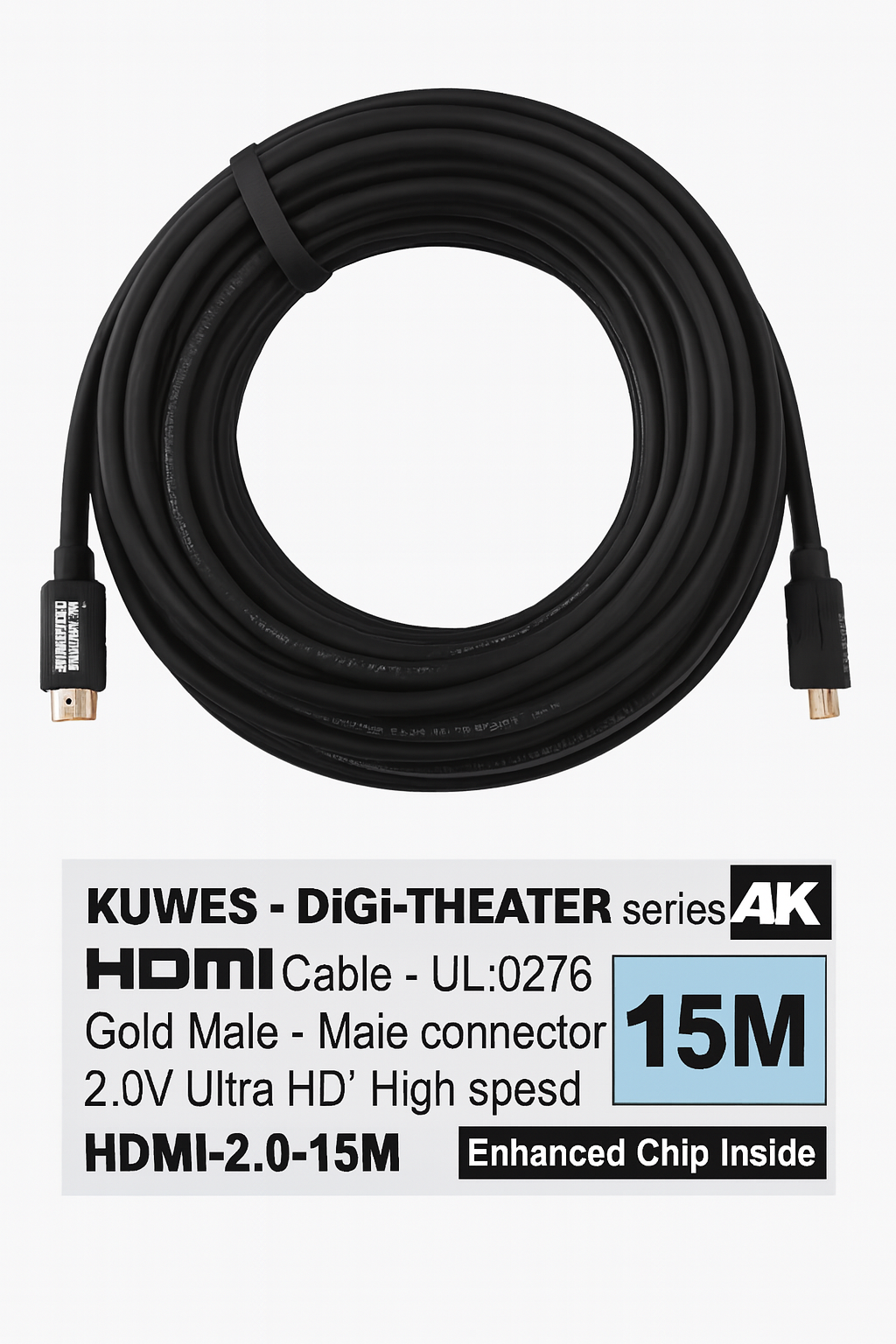 KUWES Premium Series HDMI Cable ā 15MTR Engineered for high-performance digital connectivity, the KUWES DiGi-THEATER Series HDMI cable delivers ultra-fast transmission and crystal-clear visuals for professional and home entertainment setups.