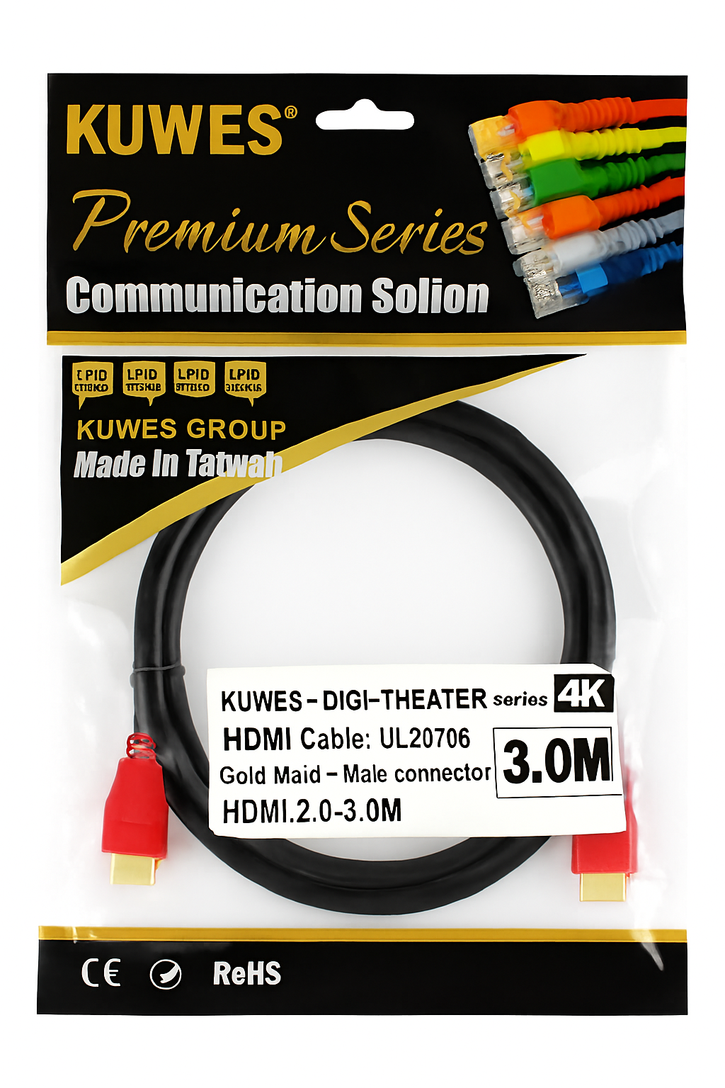 KUWES Premium Series HDMI Cable ā 3MTR Engineered for high-performance digital connectivity, the KUWES DiGi-THEATER Series HDMI cable delivers ultra-fast transmission and crystal-clear visuals for professional and home entertainment setups.