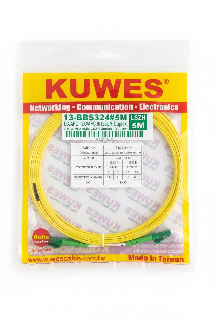 The KUWES 13-BBS324#5M is a singlemode duplex LC/APC to LC/APC fiber optic patch cord designed for high-performance data and optical transmission systems. It offers superior low-loss connections, making it ideal for telecom networks, data centers, FTTH, and optical equipment interconnections.