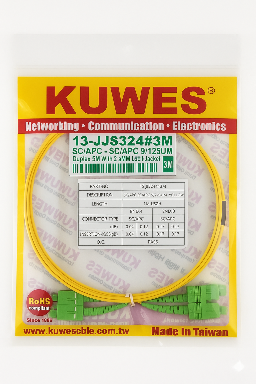 High-performance singlemode duplex fiber optic patch cord designed for reliable, low-loss data transmission. Ideal for telecom networks, data centers, and FTTH applications. The cable features SC/APC connectors on both ends, ensuring precise connection with minimal reflection. The 2.0mm LSZH yellow jacket provides durability, flexibility, and flame retardance for indoor installations.