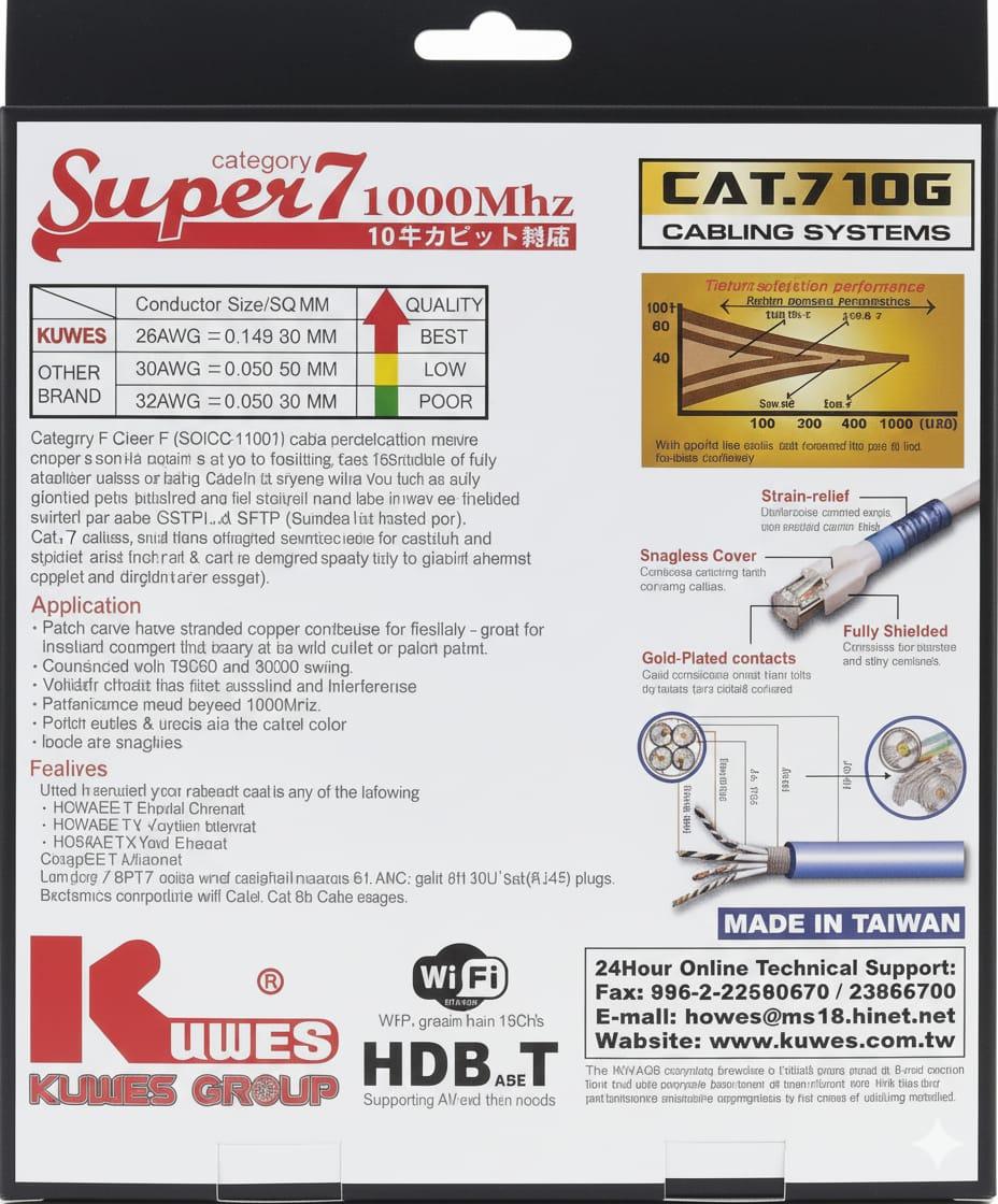The KUWES Super 7 Cat.7 Patch Cord is a premium-quality Ethernet cable built for 10 Gigabit Ethernet networks. Featuring S/FTP double shielding and pure oxygen-free copper (OFC) conductors, it ensures stable, high-speed data transmission with minimal interference. Perfect for professional networking environments that require reliability and top performance.